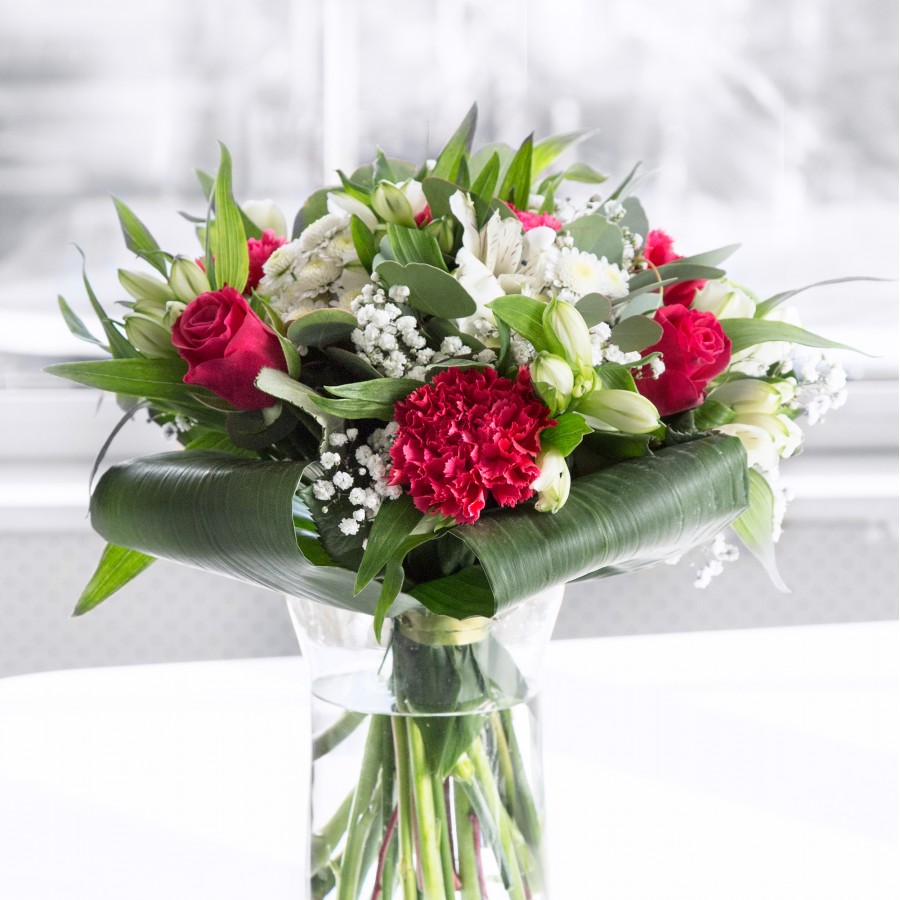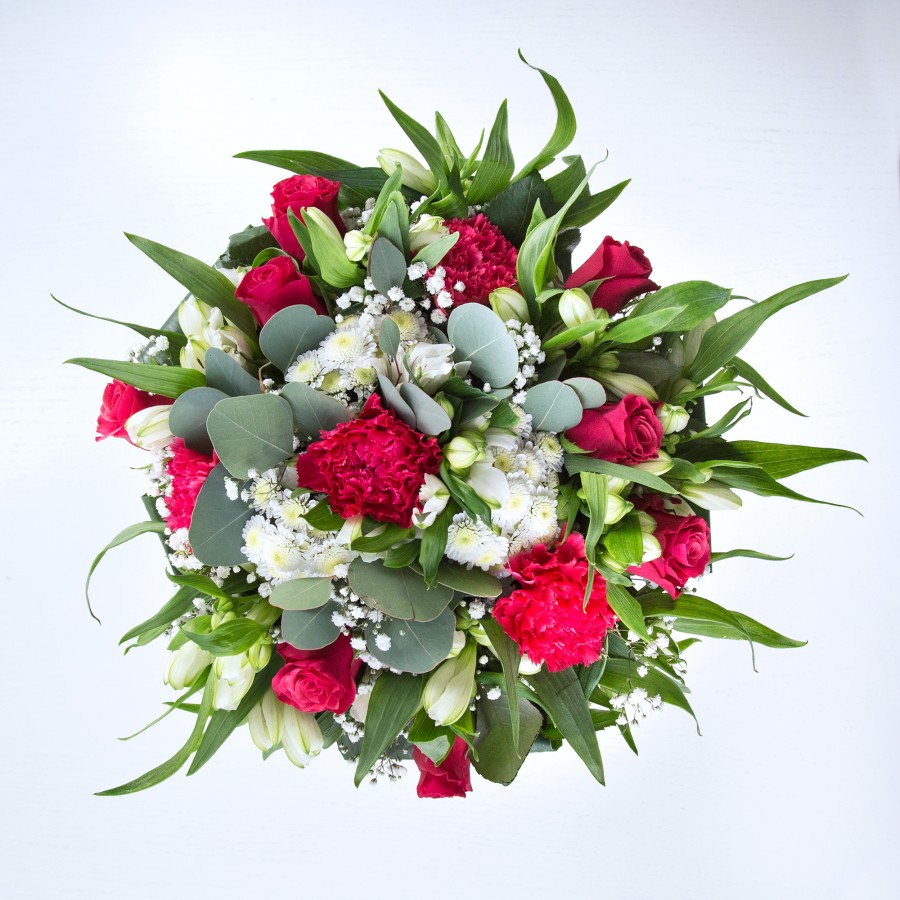 Enhance any space with our stunning bouquet, a perfect fusion of vibrant colors and delicate design. This exquisite arrangement features rich red roses and carnations combined with sweet white chrysanthemums and gypsophila, gracefully arranged with white alstroemeria and aspidistra leaves.