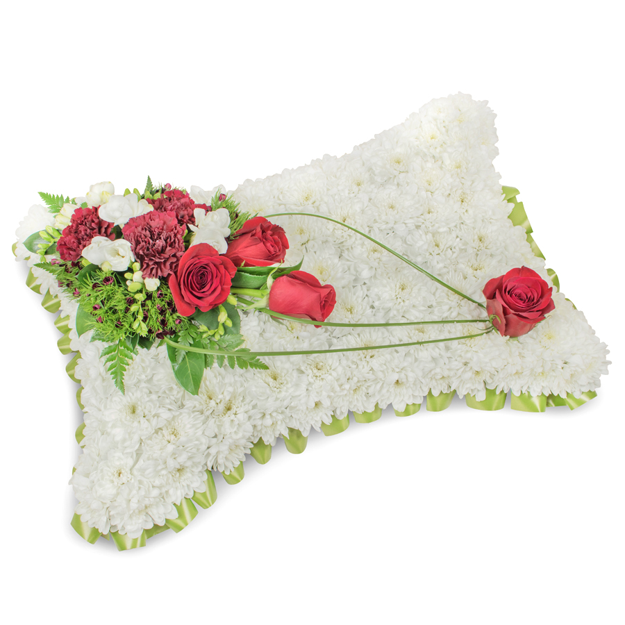 Convey Your Sympathy with our elegant floral arrangement featuring a stunning mix of white chrysanthemums, bold red roses, fragrant white freesias, dark red carnations, graceful dianthus, and bear grass. Each bloom is carefully hand-picked to ensure maximum freshness and beauty.